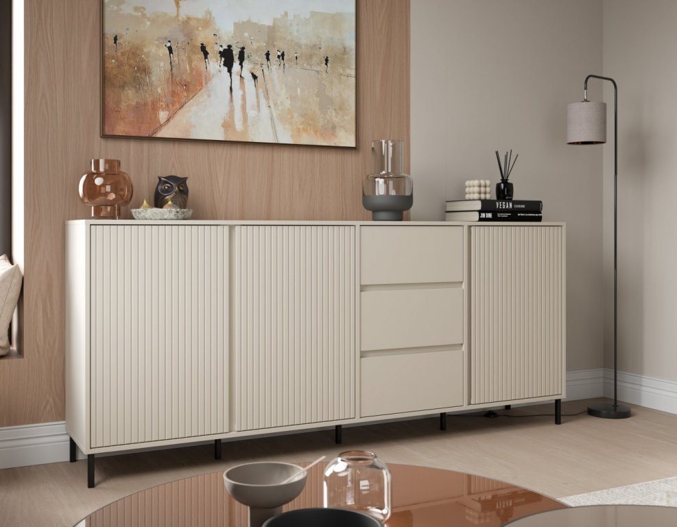 Komoda nowoczesna 212 cm – AVENALE AVEK02 kaszmir, komoda z wieloma półkami i szufladami, pojemny mebel do salonu, jadalni a nawet sypialni, matowe wykończenie, cichy domyk w drzwiach, szuflady pełen wysuw, prześwit na robota 12 cm, elegancka komoda na metalowych nóżkach idealna do nowoczesnych aranżacji.