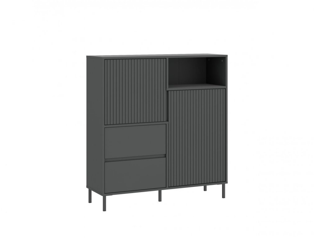 Mebel wyposażono w wiele praktycznych rozwiązań. Dwie pojemne szuflady na prowadnicach kulkowych z pełnym wysuwem ułatwiają organizację dokumentów, akcesoriów lub tekstyliów. Uchylne fronty kryją przestronne półki, które pomieszczą większe przedmioty lub zapasy domowe. Otwarta wnęka stanowi idealne miejsce na dekoracje, książki czy drobną elektronikę. Komfort użytkowania podnosi system cichego domyku drzwi. Brak klasycznych uchwytów i zastosowanie wygodnych wybrań we frontach podkreśla prostą, ale dopracowaną estetykę. Korpus wykonano z płyty wiórowej laminowanej, a fronty z płyty MDF, co przekłada się na trwałość oraz łatwość pielęgnacji powierzchni.