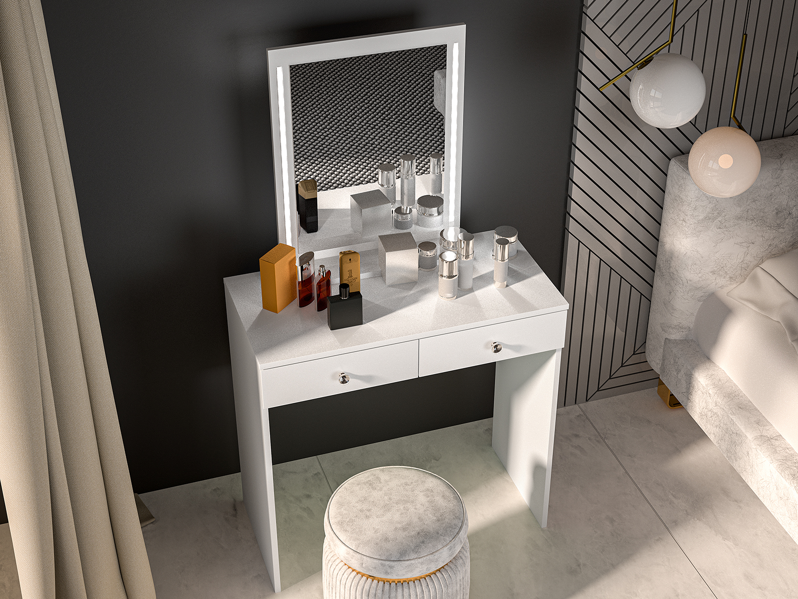 Ma odpowiednio duży blat oraz dwie szuflady na kosmetyki, akcesoria czy też biżuterię. Posiada także lustro z pionowym oświetlenie w postaci listw LED, które są wmontowane w ramę. Ergonomiczny kształt oraz przemyślana konstrukcja daje możliwość wsunięcia pufy pod blat, a dzięki niedużym wymiarom można usytuować ją nawet w niewielkiej sypialni lub pokoju. Solidnie wykonana z dbałością o każdy detal, stabilna konstrukcja toaletki pozwali cieszyć nią przez wiele lat.