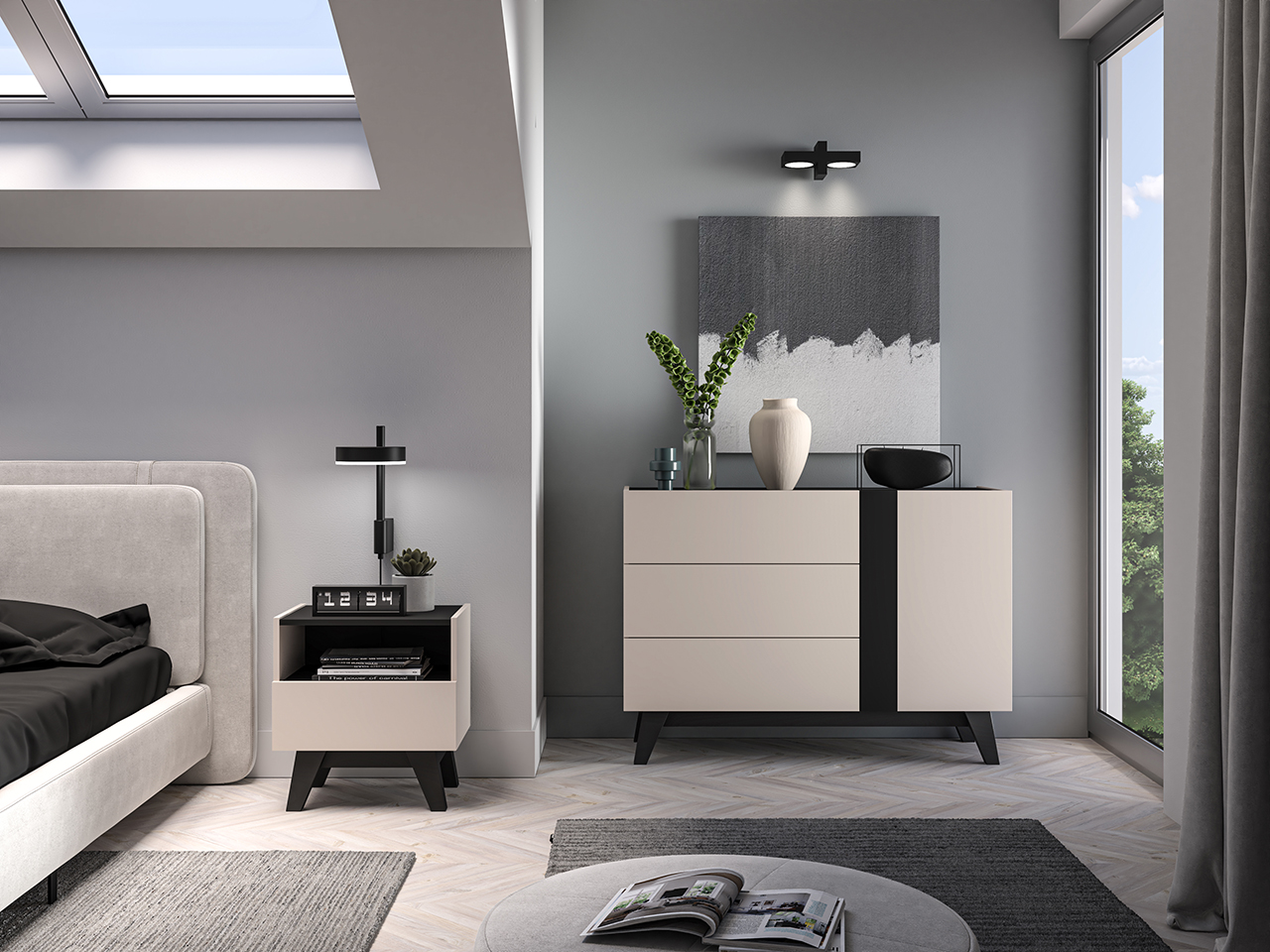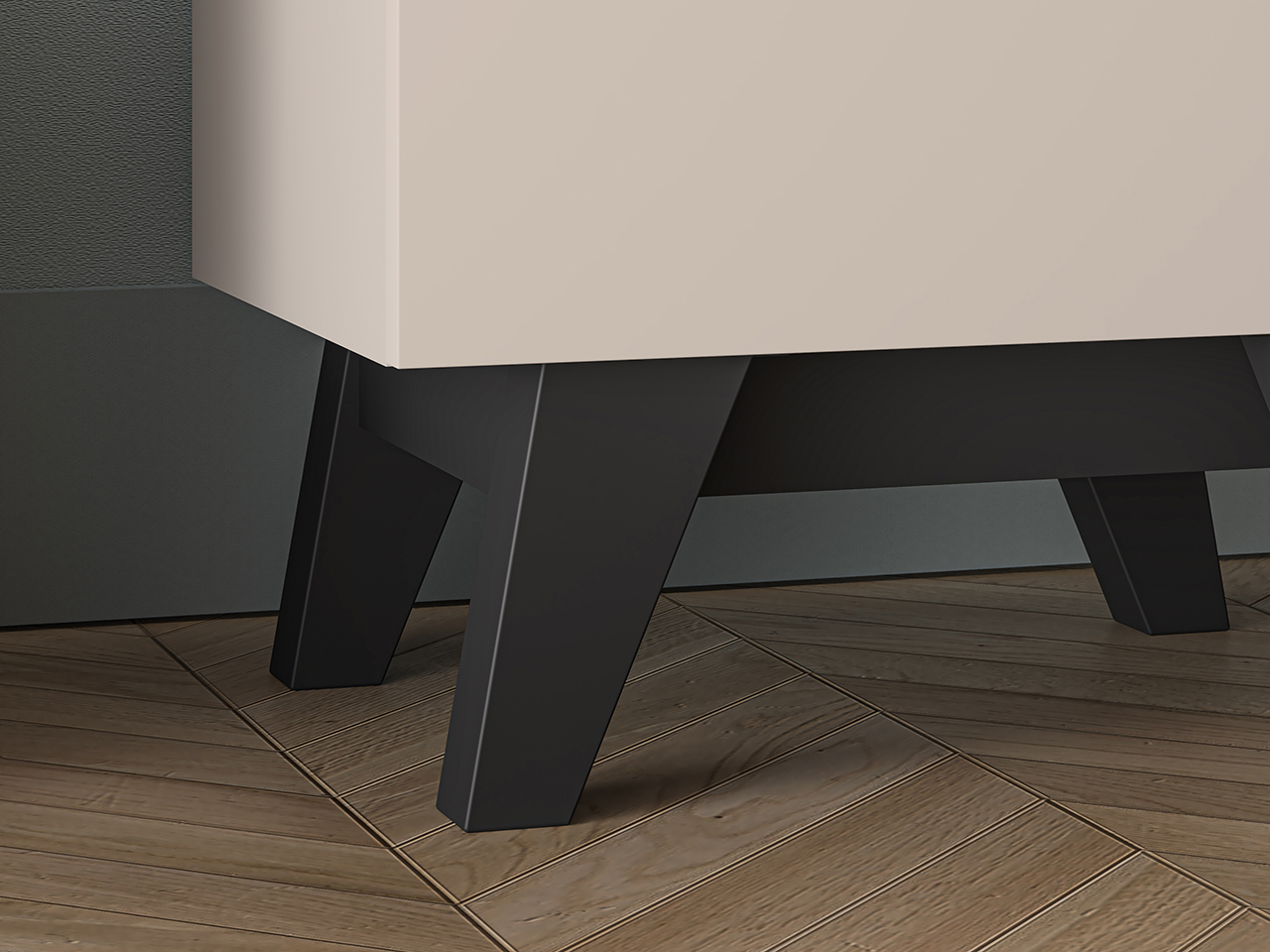 Wyrafinowany kaszmirowy kolor frontów i boków dopełniliśmy klasycznie czarną wstawką, blatem i podstawą. Stylowe nóżki dodają meblom lekkości i wyjątkowego charakteru, a bezuchwytowe fronty dodatkowo podkreślają współczesny design. Starannie wyselekcjonowane typy brył pozwolą zaaranżować wiele wnętrz, niezależnie od ich metrażu.