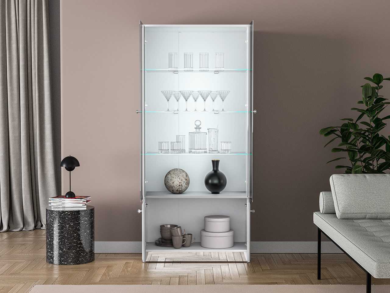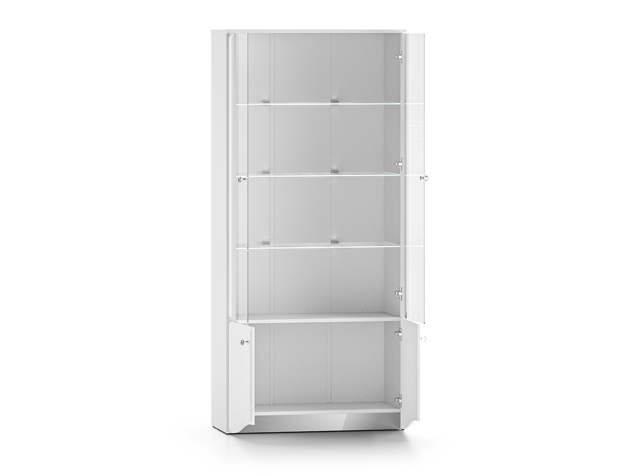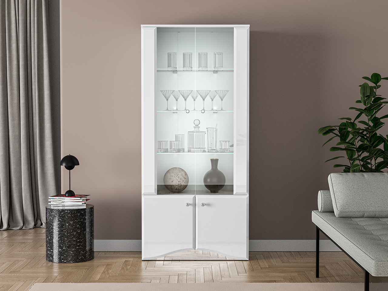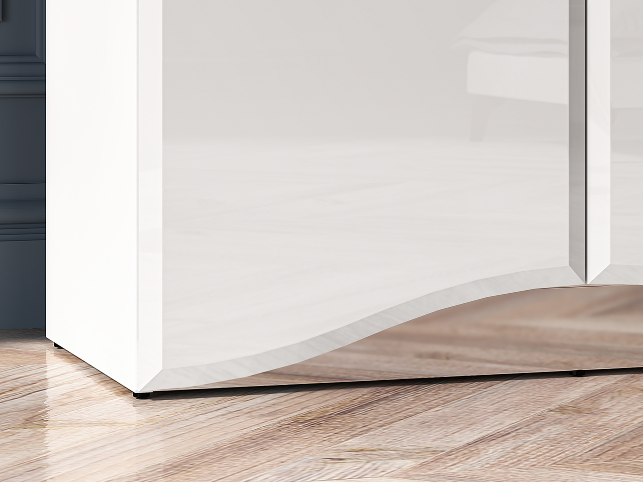 Styl mebli podkreślają zaokrąglone fronty w białym połysku wykonane z płyty MDF oraz lustrzany cokół, który przyjmuje kolorystykę otoczenia. Luksusowy charakter mebli tworzy również oświetlenie LED – dodające wnętrzu oryginalnego klimatu – oraz wygodne zawiasy z cichym domykaniem. Całości dopełnia zestaw chromowanych uchwytów z imitacją diamentu – rozpraszają one światło tworząc magiczny efekt.