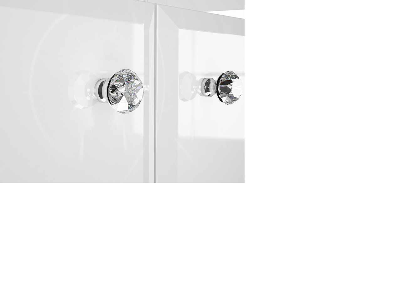 Styl mebli podkreślają zaokrąglone fronty w białym połysku wykonane z płyty MDF oraz lustrzany cokół, który przyjmuje kolorystykę otoczenia. Luksusowy charakter mebli tworzy również oświetlenie LED - dodające wnętrzu oryginalnego klimatu - oraz wygodne zawiasy z cichym domykaniem. Całości dopełnia zestaw chromowanych uchwytów z imitacją diamentu - rozpraszają one światło tworząc magiczny efekt.