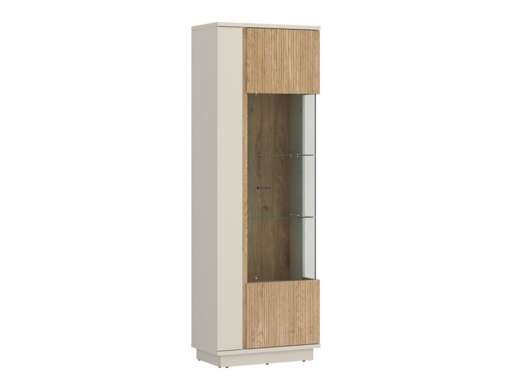Witryna z kolekcji MOSANO to propozycja dla tych, którzy cenią stylową prostotę z wyczuciem detalu. Smukła, wysoka bryła modelu LUSV101 dodaje wnętrzu lekkości, a przeszklony front i bok pozwalają subtelnie wyeksponować dekoracje lub szkło. Ciepły dekor dębu cremona w połączeniu z trendowym kolorem kaszmiru tworzy spójną i nowoczesną kompozycję, która odnajdzie się zarówno w jasnym salonie, jak i bardziej stonowanej jadalni.