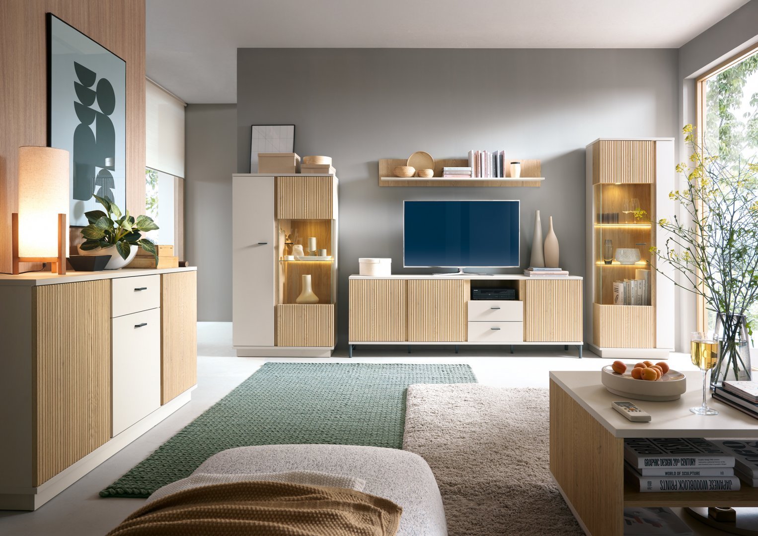 Mosano to kolekcja, która nie tylko daje Ci wybór, ale też zachwyca subtelnym, dopracowanym wzornictwem. Delikatny odcień kaszmiru w połączeniu z ryflowanymi frontami w ciepłym dekorze Dębu Cremona tworzy kompozycję pełną elegancji i spokoju. To meble, które wpisują się w rytm codzienności – piękne, funkcjonalne i idealnie dopasowane do Ciebie.