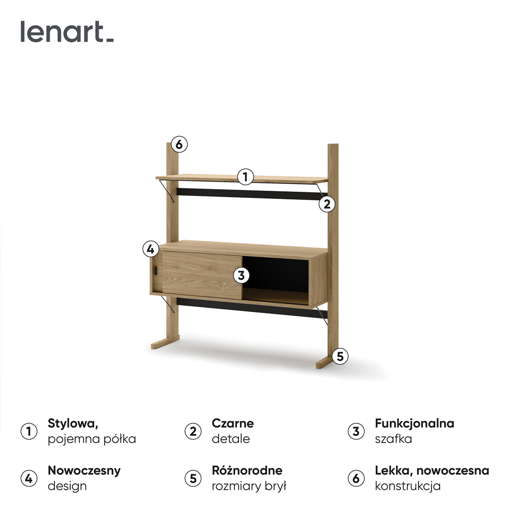 Półki i szafki umożliwiają przechowywanie wszystkiego, czego potrzebujesz, a dzięki modułowej budowie regały w mgnieniu oka przekształcisz w biurko, które łatwo wkomponuje się w wystrój Twojej przestrzeni.