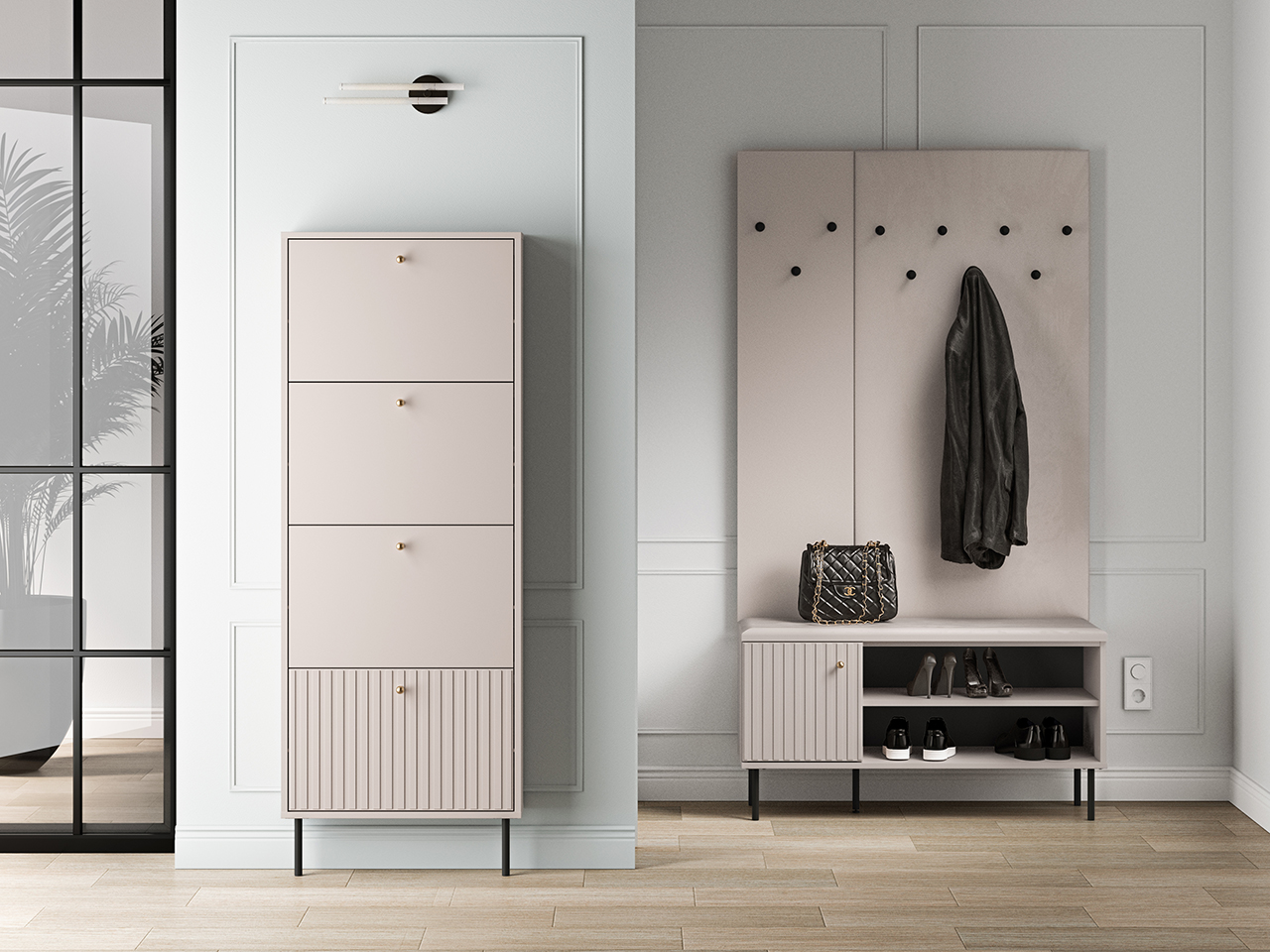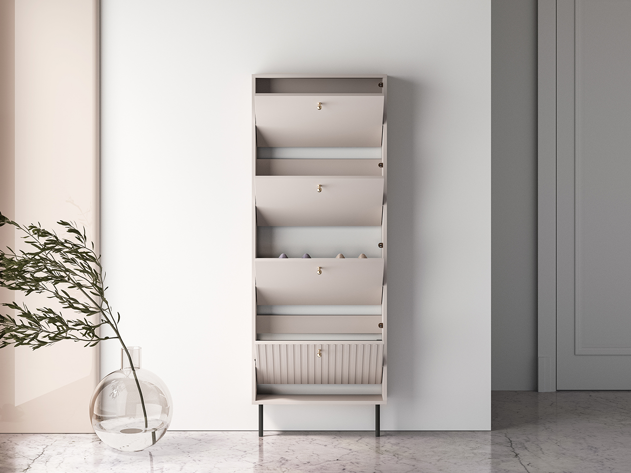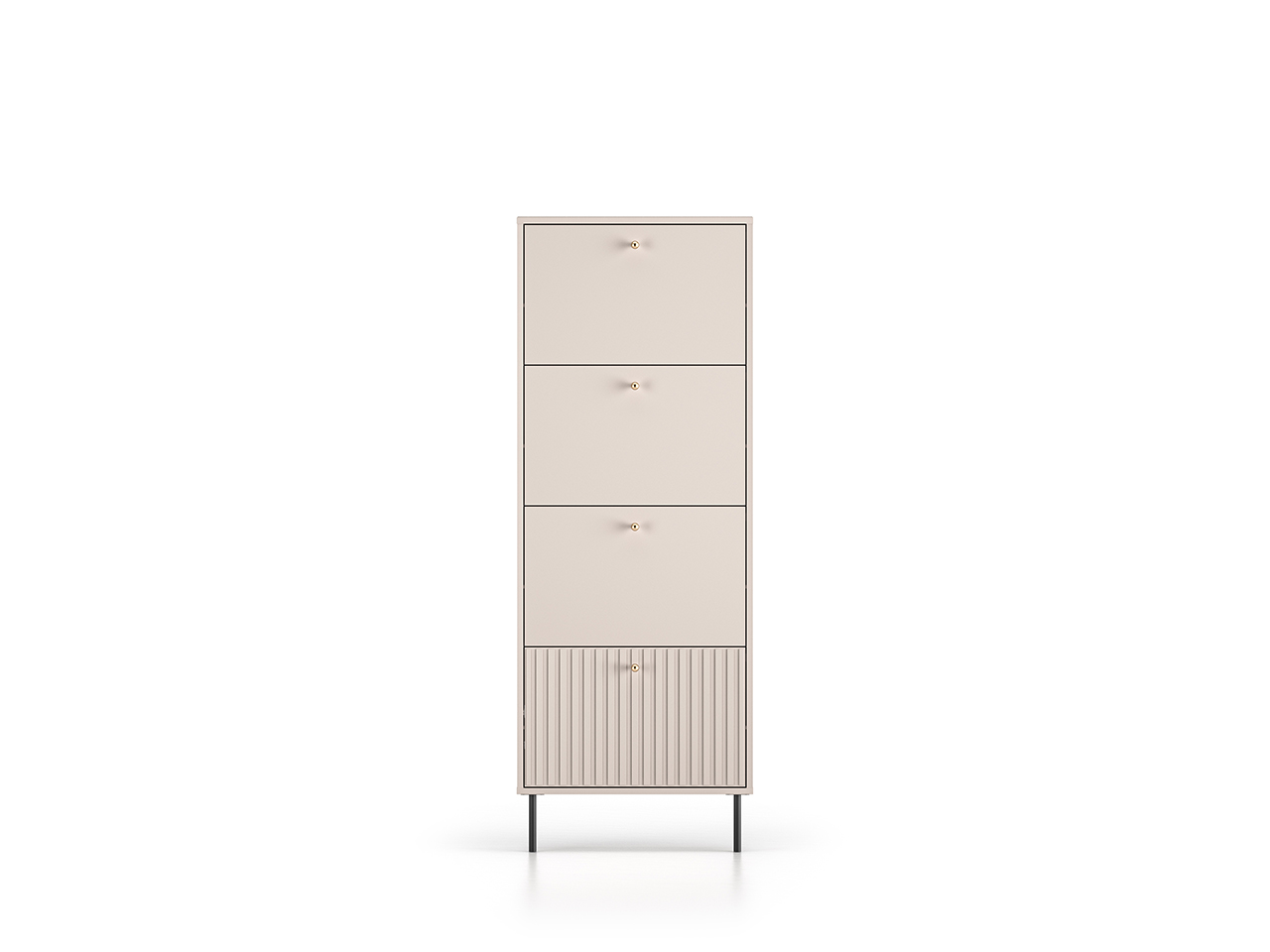Szafka na buty Sophie 26 to mebel łączący wysoką funkcjonalność i nowoczesny design. Sophie 26 to nie tylko praktyczne rozwiązanie do przedpokoju. Nasz mebel to synonim współczesnej elegancji. Kaszmirowy dekor, frezowane fronty MDF, gałki w kolorze szczotkowanego złota oraz dyskretne czarne nóżki to kwintesencja całej kolekcji Sophie.