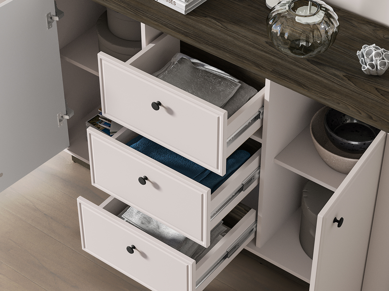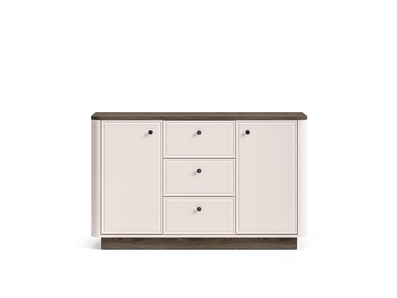 Średnia komoda Vilavio 04 to idealny mebel do przechowywania. Za obojgiem drzwi kryją się łącznie cztery pojemne wnęki. Przechowasz w nich ubrania, ręczniki czy pościel. Środek mebla tworzą trzy głębokie szuflady, które zapewnią odpowiednią ilość miejsca na dokumenty, obrusy lub inne domowe tekstylia. Komoda będzie świetnym dopełnieniem Twojego salonu lub sypialni. Szeroki blat będzie idealnym miejscem do wyeksponowania eleganckich wazonów, pamiątek z podróży lub innych ulubionych gadżetów. Wybierz komodę Vilavio i zachowaj porządek w swoim wnętrzu.