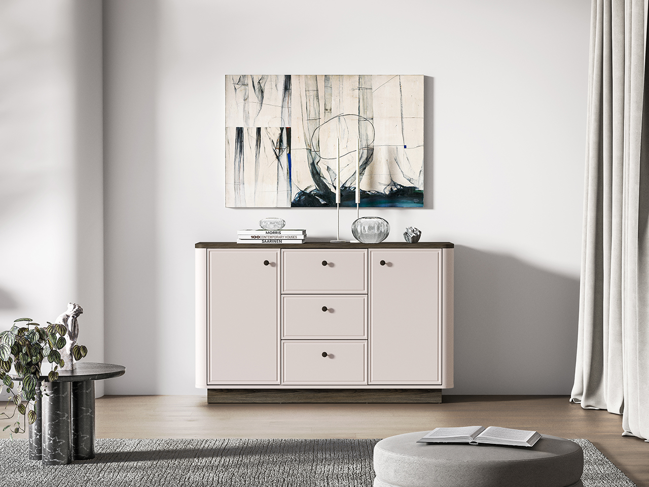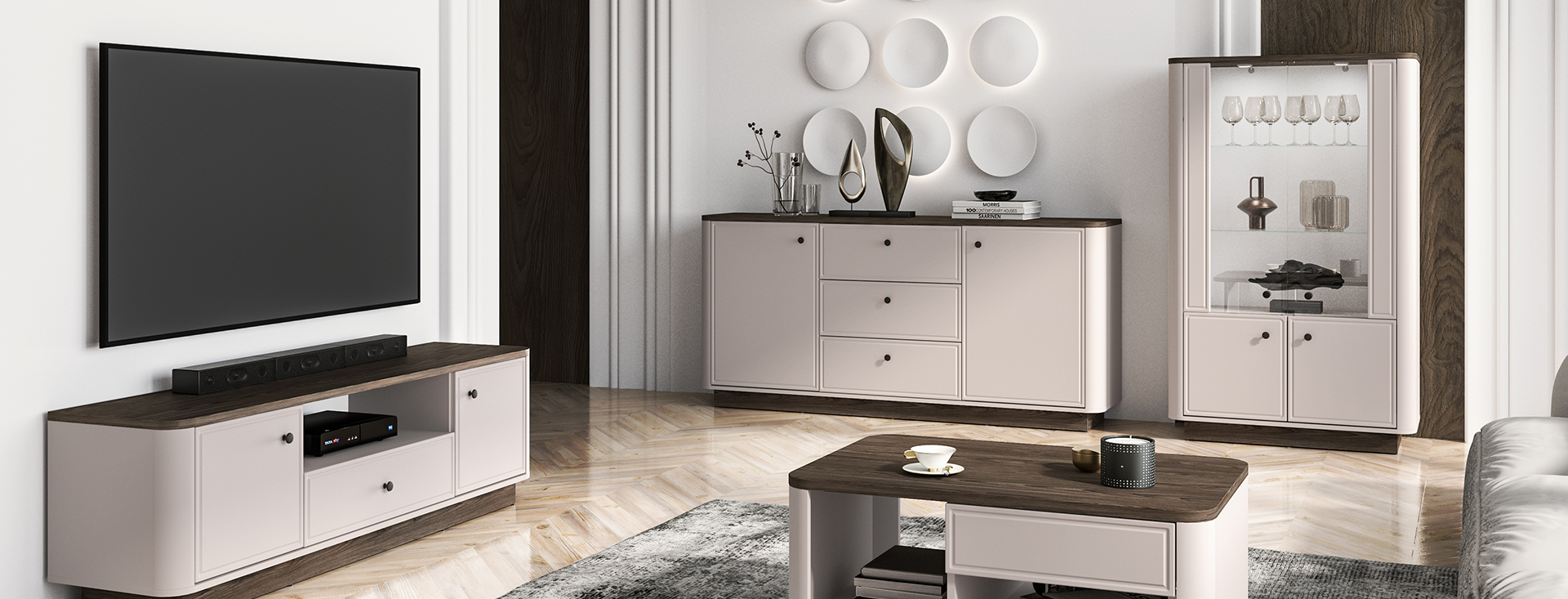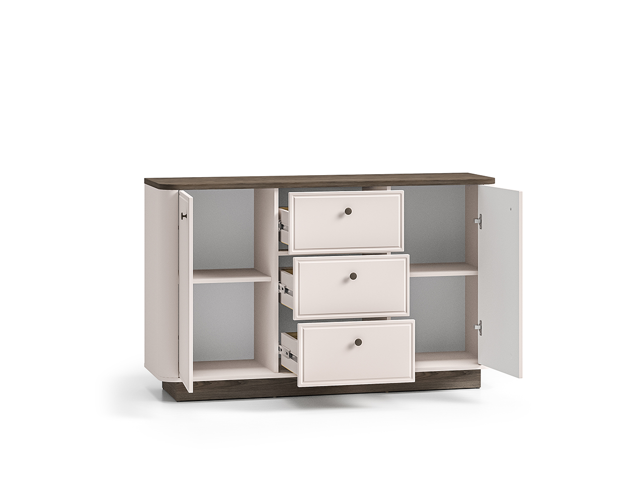 Meble Vilavio to wyjątkowo elegancka kolekcja do salonu czy sypialni. Bryły przyciągają uwagę pięknie zaoblonym przejściem między korpusem a frontami. Kontrastowe zestawienie dekorów – klasyczny kaszmirowy oraz ciemno barwiony dąb Windmill - podkreśla charakter mebli Vilavio. Drzwiczki oraz szuflady wykonane z płyty MDF z ozdobnym frezowaniem wskazują na wyrafinowany styl całej kolekcji. Gustowne, metalowe uchwyty dodają całości szyku i wysmakowania. Meble Vilavio wypełnią Twoje wnętrze wytwornością i finezyjną estetyką.